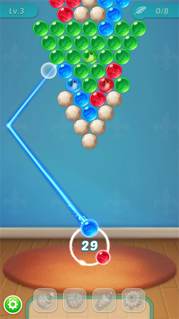 2. 消除泡泡:当三个或更多相同颜色的泡泡相邻时,它们将被消除。