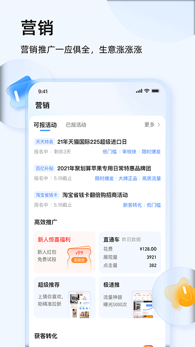 4. 营销推广:支持优惠券发放、直通车推广等功能。