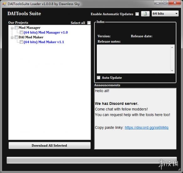 龙腾世纪:审判 DAITools MOD管理器 v1.0.0.8,这是一款非常实用的MOD管理工具,不过缺乏稳定性。全名DAITools Suite Loader,主要用于导入MOD。这个简单的应用程序允许您下载并保持最新的所有工具开发的套件。加载器本身在有补丁时自动升级。这意味着,通过下载这个,你将永远不必从Nexus下载(不过要通过科学上网...)如果加载器没有打开,而是显示一个“无法加载ProjectList”错误,这仅仅是由于dropbox问题。这意味着DropBox已经关闭,正在经历一些问题。我们无法控制它。只要稍微等一下,直到他们解决问题。与此同时,您仍然可以手动启动工具,通过到加载器的文件夹,然后进入“工具”。