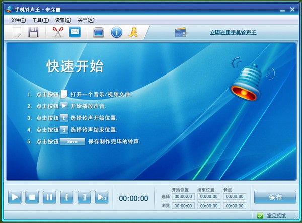 这款手机铃声王,您可以制作MP3手机铃声,WMA手机铃声,WAV手机铃声,AMR手机铃声……一款万能手机铃声制作软件!只需要将你的其他格式文件用手机铃声王打开,选择好你想制作的手机铃声起始位置和结束位置,点击保存,立刻搞定!现在就下载,即刻体验手机铃声王!