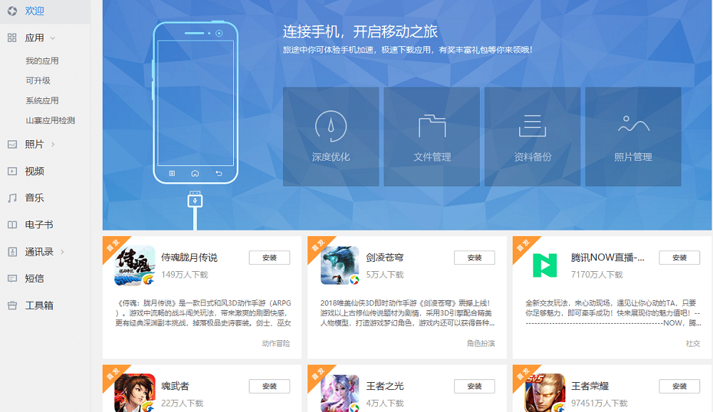 应用宝pc版(原腾讯手机管家pc版)是腾讯推出的第三方安卓智能手机综合管理软件,其致力于为用户提供手机安全和资源管理的一站式手机管理解决方案。使用应用宝pc版,不仅可以免费下载到丰富的安卓软件、游戏、音乐、视频、电子书、壁纸等资源;还可以便捷地进行手机优化、应用检测、一键root、资料备份等操作。