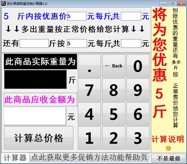 英乐果蔬限量促销计算器电脑版是一款实用的限量促销计算器。英乐果蔬限量促销计算器最新版支持自定义的地方包括限量促销的斤数,限量促销的价格,正常销售的价格,带有记忆功能,随时能改。英乐果蔬限量促销计算器电脑版使用方法很简单,输入重量,点击计算按钮,一键计算价格。