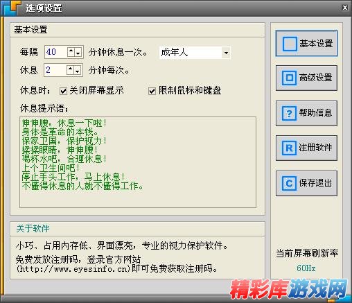 眼睛是心灵的窗户,长时间使用电脑会导致视疲劳,影响视力健康。护眼之星提醒您定时休息,让眼睛得到休息,呵护心灵的窗户,从今天开始。该软件简单好用,体积小巧,界面漂亮,设置方便。专门优化了内存占用,运行时占用内存在同类软件中最低。能够根据用户的鼠标键盘操作状态判断连续工作时间,通过定时提醒和可设置的强制关闭屏幕显示和键盘输入,可有效防止电脑用户因长时间在电脑前工作游戏引起的视疲劳。