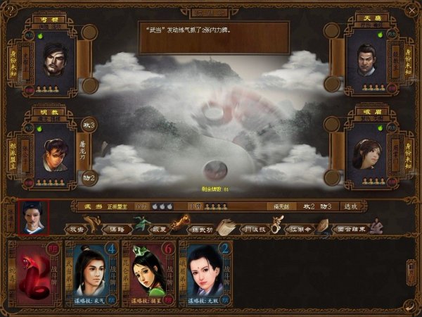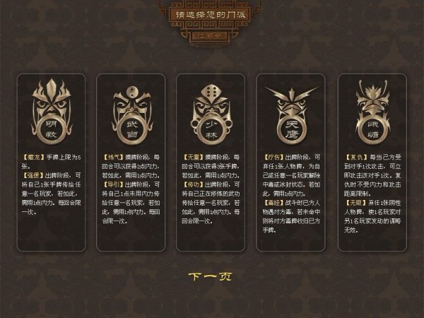 江湖令之倚天屠龙(Legend of the command)是一款武侠桌面游戏。江湖令之倚天屠龙是一款2-8人都可以玩的游戏,本程序版本为2.0,模拟5人游戏。并且可以通过游戏获得实物版积分兑换奖励。在游戏中,你可以选择扮演少林、武当、明教、峨眉、丐帮、天鹰、昆仑、华山、崆峒、波斯等众多门派的掌门人,当然每派掌门都有其独门绝技。唯美的卡牌设计。一流画师的倾心之作,使观赏也成为一种享受。
