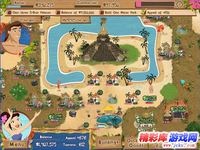 游戏中的每个关卡都设计了各自的过关任务,其中包括累积金钱数量,建造指定的设施,房屋的等级要求等。玩家要通过不断建造房屋来达到过关要求,同时你还要策划购买的先后顺序,合理运用金钱。