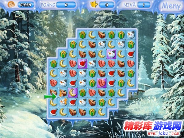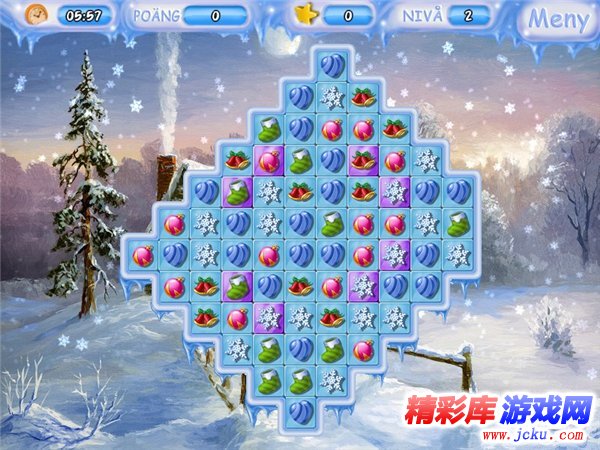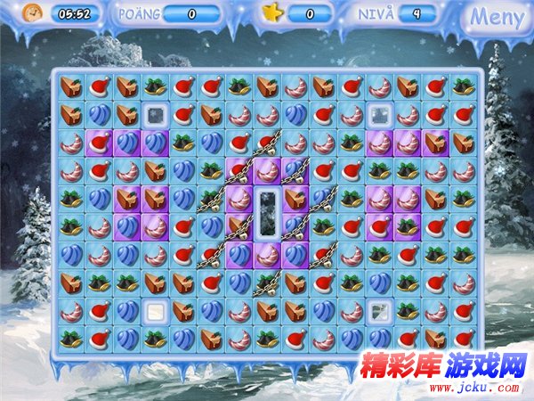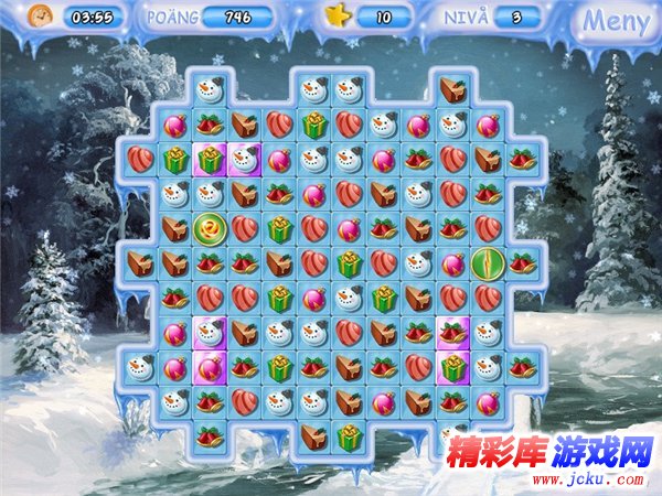 游戏画面由卡通感十足的精美2D图像构成。不仅多幅漂亮的雪景背景图交替变化另人心旷神怡。前景为消除区域,由各种可爱的圣诞物品组成。整体画面充满欢快的圣诞气氛,唯美中带有一份俏丽。